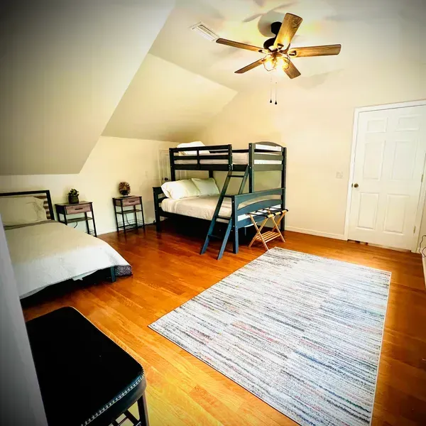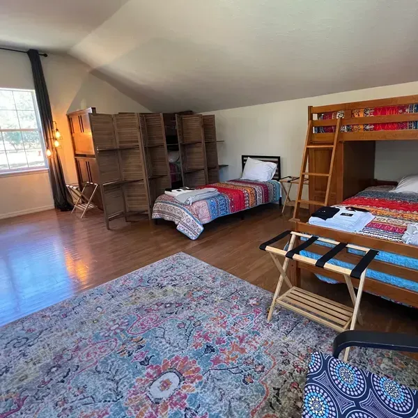 A sanctuary adorned with organic bamboo mattresses for a restful sleep. Set up for one king bed and one twin bed or three twin beds.