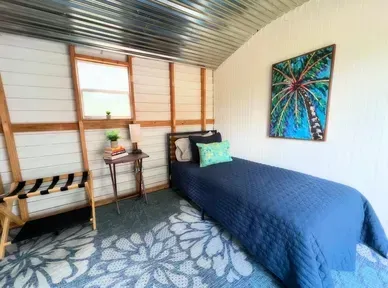 with a comfortable twin bed, heating and air conditioning. The rustic charm of the she-sheds is