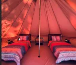 A 15-foot sanctuary adorned with eclectic dƩcor, including two plush twin beds, ideal for friends,